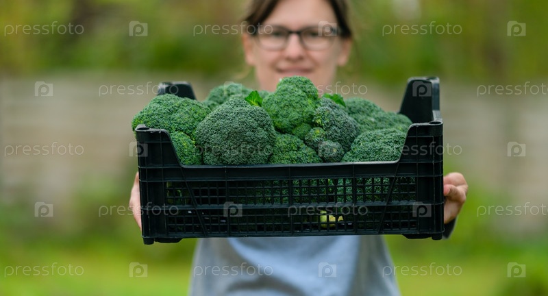 Улыбающаяся фермерка держит в руках коробку свежих брокколи.Осенний урожай, органическое земледелие, здоровый образ жизни и натуральная пища, богатая витаминами и клетчаткой.Горизонтальный баннер