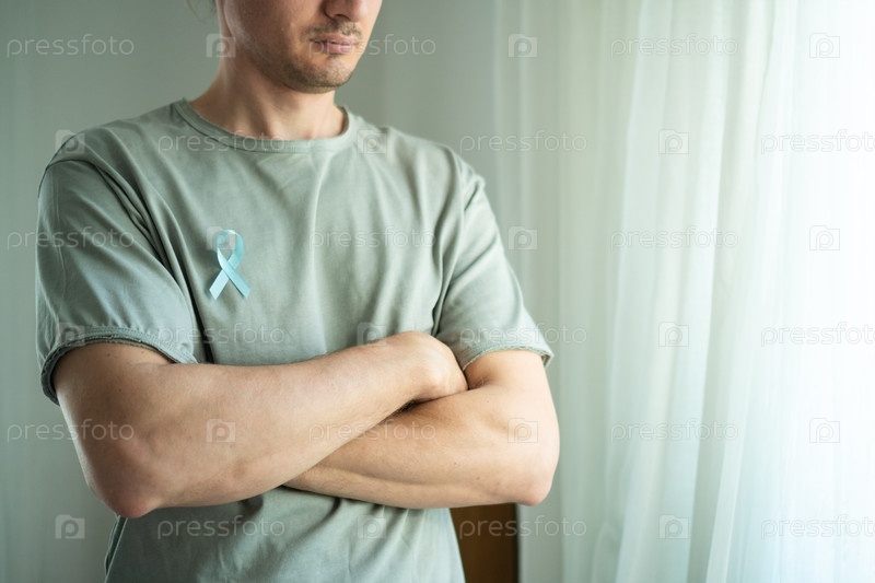 Мужчина со скрещенными руками в синей ленте для повышения осведомленности о раке простаты