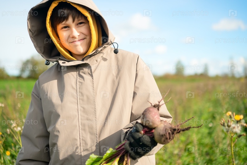 Счастливый мальчик собирает зрелые свеклу в своих руках на ферме. сельское хозяйство под открытым небом, сезонные овощи, здоровое питание, свежие продукты и гордость за семейную фермерскую работу