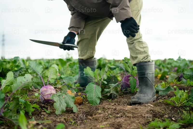 Молодой мальчик-фермер собирает кохраби в поле