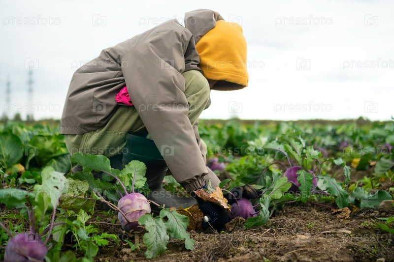 Мальчик собирает кохраби на ферме. сезонные овощи, здоровая пища, свежие продукты, работа на открытом воздухе, домашние культуры, устойчивое сельское хозяйство и гордость за культивируемые культуры