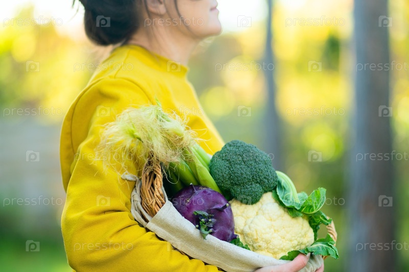 Покрывайте руки фермерки, держа в руках ткань из корзины с брокколи, цветной капустой, колрабой и молодой кукурузой.Осенний урожай, концепция сельского хозяйства, здоровое питание, волокна, сельское хозяйство и питание
