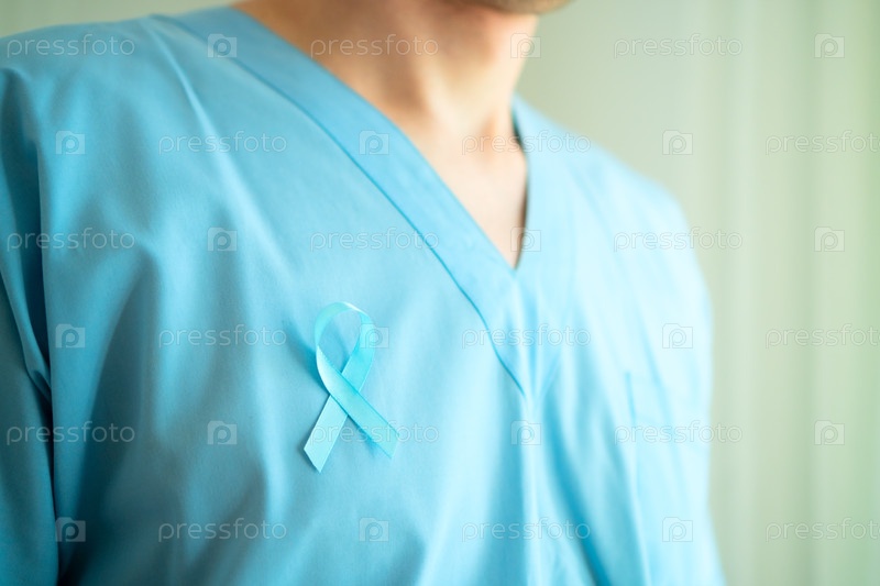 Врач в медицинской одежде с синей лентой на груди, символизирующая ноябрьскую осведомленность о раке простаты и раннюю диагностику для своевременной медицинской помощи