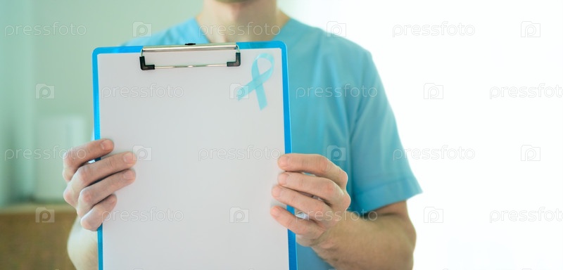 Врач-мужчина в медицинской форме держит доску с голубой лентой и пустым листом.Горизонтальный баннер на ноябрьский месяц осведомленности о раке предстательной железы является символом профилактики и поддержки ранней диагностики