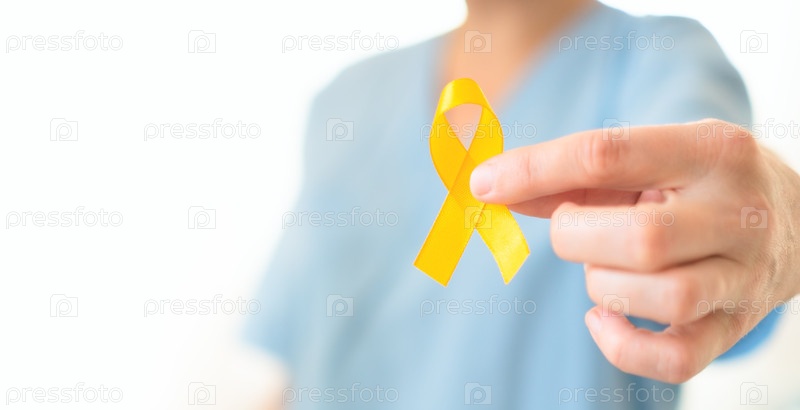 Закрытая женщина-врач и медсестра в форме, держащая желтую ленту в руке. Горизонтальный баннер. Символ борьбы с детским раком, медицинской поддержки, диагностики, лечения, семейного ухода и осведомленности