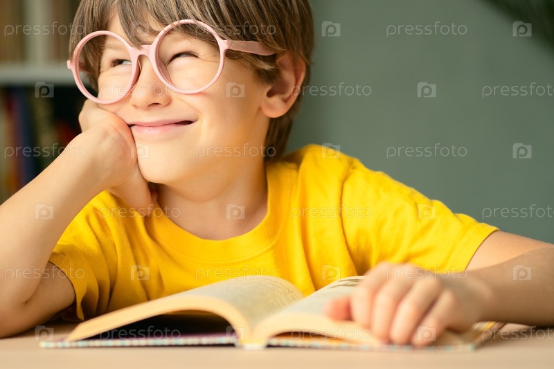 Счастливый школьник с очками сидит за столом, опираясь на свою руку с открытой книгой. концепция чтения, обучения, образования, умного мышления, обучение в детстве, подготовка к школьной жизни
