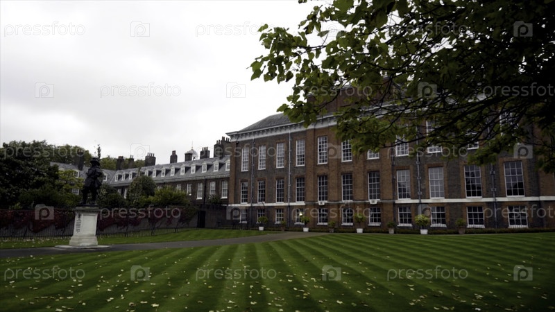 Чистый двор с зеленой лужайкой старого поместья. Идите дальше. Старый усадебный дом со внешним двором и идеальным газоном в пасмурную погоду. Архитектура и ландшафт старого усадьбы