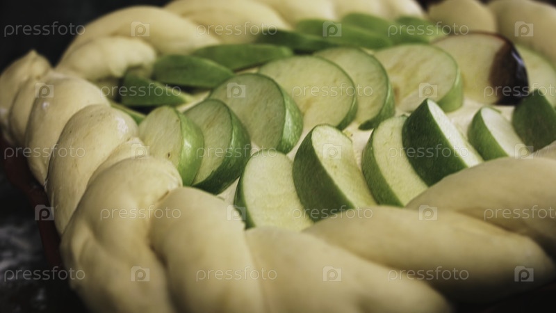 Срезки свежих яблок, лежащие в трех рядах в сыром тесте, концепция приготовления