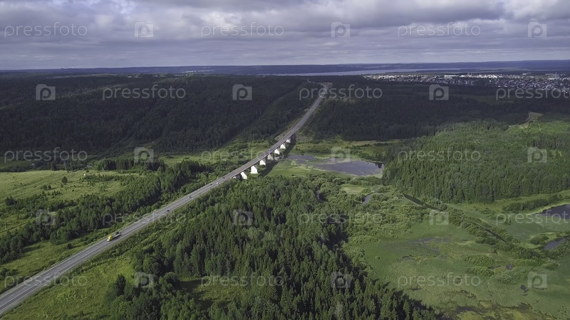 Вид моста, проходящего через лес. Клип. Автомагистраль идет через болото в лесу до города на горизонте. Движение по сельской дороге в пасмурную погоду