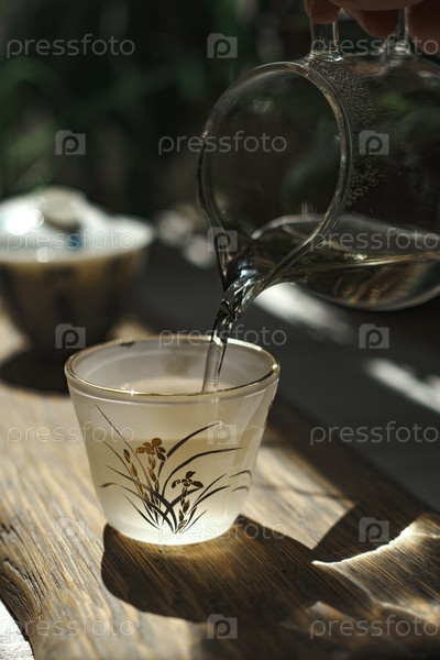 Деликатная стеклянная чашка, заполненная ароматическим чаем, создает спокойную атмосферу для расслабленной чайной церемонии