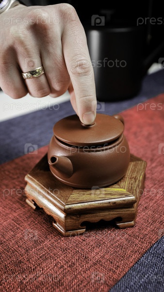 Рука, нажимающая крышку красивого глиняного чайника во время безмятежной чайной церемонии на красочной скатерти