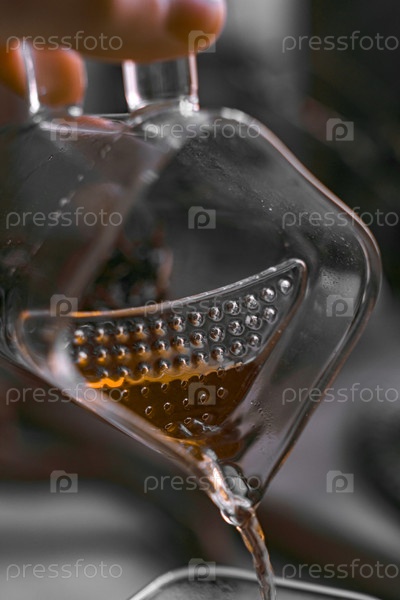 Накачивание богатой жидкости через деформатор в красиво украшенный стеклянный контейнер