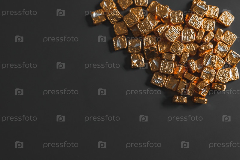 Красивые золотые карамельные конфеты, красиво расположенные на поверхности темного фона