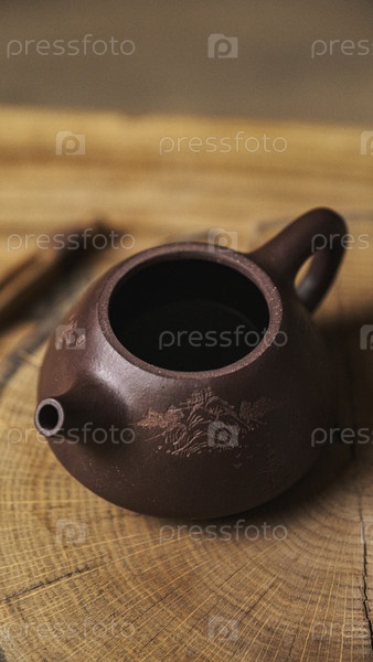 Деревенский глиняный чайник опирается на изношенную деревянную поверхность, демонстрируя свое изысканное мастерство и естественную элегантность