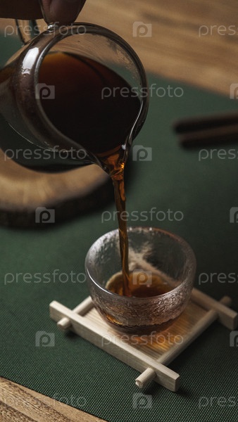 Спокойный момент разворачивается, когда чай мягко наливают в хрупкую стеклянную чашку, подчеркивая спокойствие и мастерство