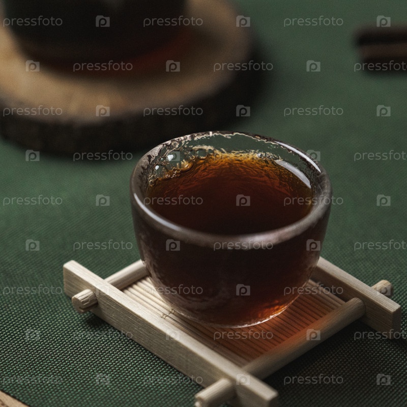 Красивая нежная чайная чашка, наполненная богатым темным чаем, изысканно и тщательно размещена на деревянной стойке