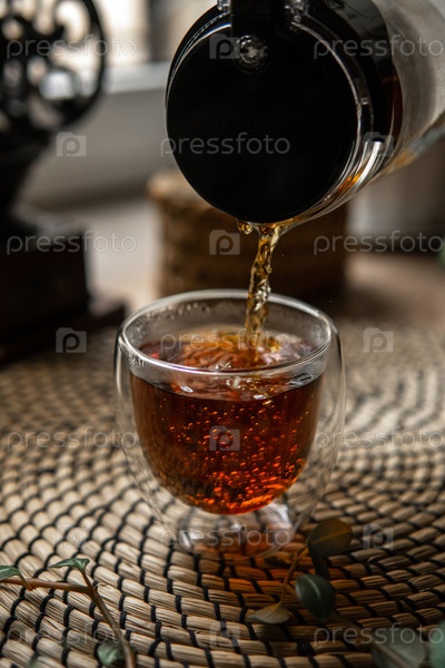 Теплый чай тщательно наливают в красиво спроектированную стильную стеклянную чашку, расположенную на естественной поверхности