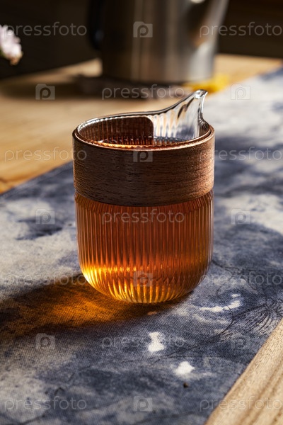Красиво изысканный стеклянный чайник элегантно наливает богатый янтарный чай в стильную чашку, опирающуюся на текстурированную поверхность