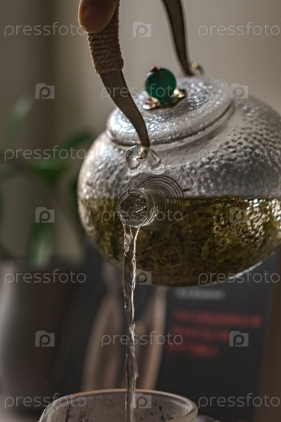 Красиво обработанный и изящный чайник элегантно наливает ароматический травяной чай, показывая спокойствие и тепло