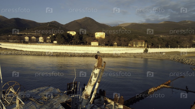 Вид на старый и разрушенный багажник корабля с чайкой, сидящей на ржавой трубе на закате солнца