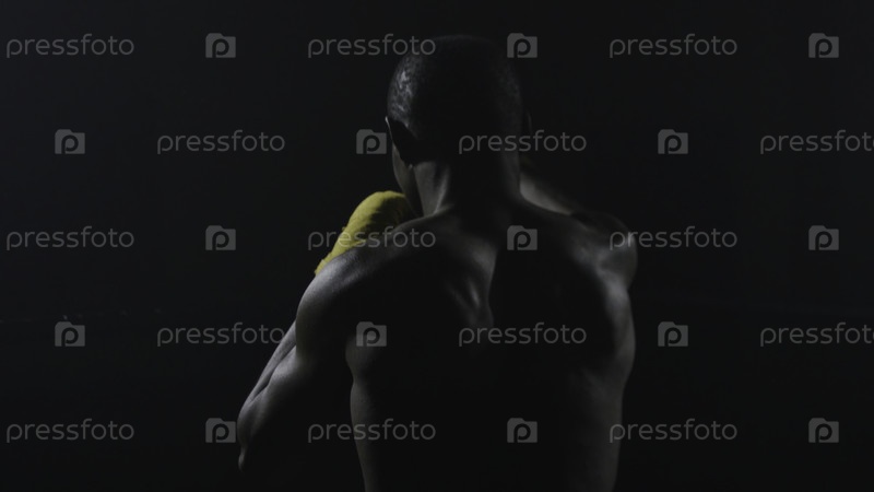 Мускулистый мужчина с заднего вида боксирует на черном фоне молодой афроамериканский боксер, практикующий тень. Боксёр в желтых перчатках