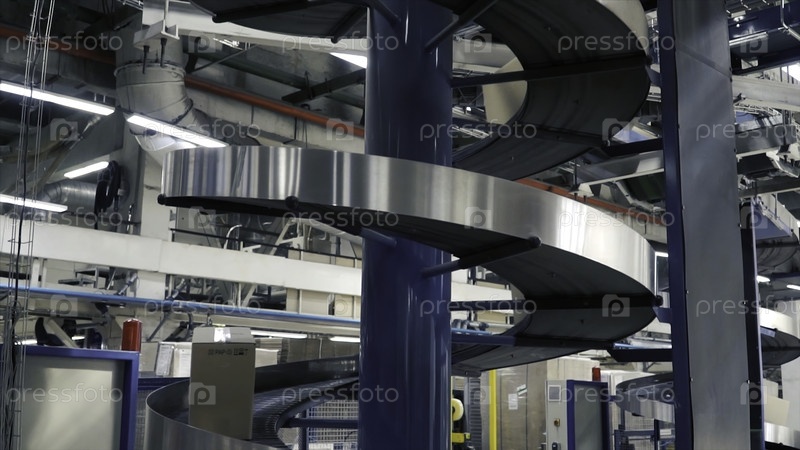 Картонные коробки на конвейерной ленте на фабрике. Производственная линия, на которой коробочки движутся по спирали