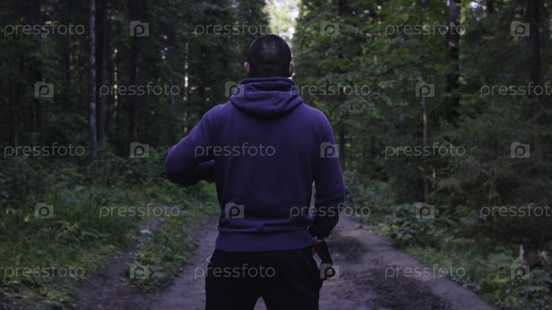 Человек в капюшоне стоит.Человек с капюшоном в лесу.Спорт в лесу на природе