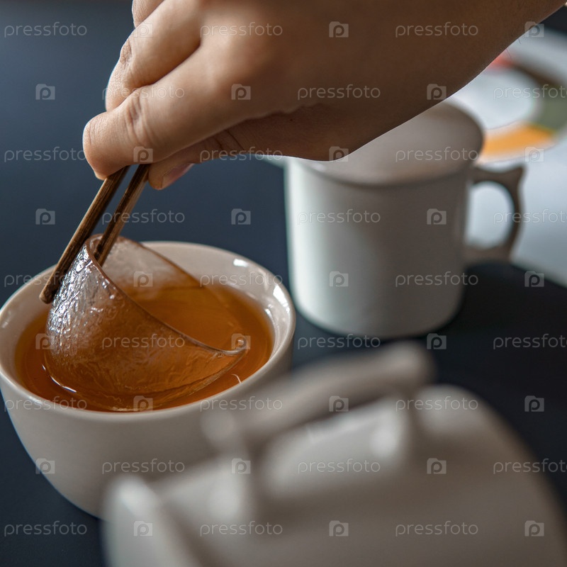 Рукой грациозно с помощью палочек погрузить миску в чашку чая, демонстрируя спокойный чайный момент