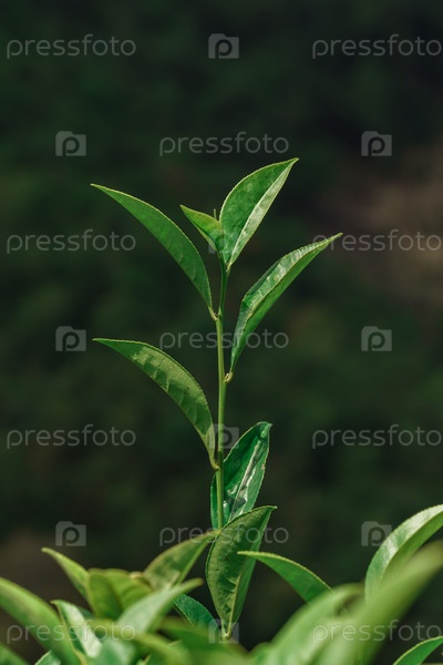Яркий крупный план свежих, ярких зеленых листьев чая, красиво настроенных на мягко размытый фон