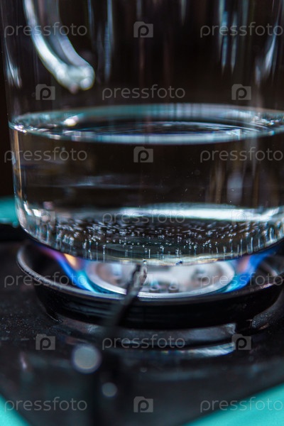 В стеклянном чайнике кипит вода, которая помещается на газовую плиту для приготовления пищи