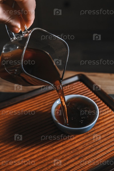 Спокойный момент ароматного чая, залитого в обработанную миску, демонстрирующий мастерство и вкус опыта