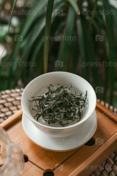 Спокойное отображение ярко-зеленых листьев чая в миске, окруженной пышным зеленым, создает успокаивающую атмосферу