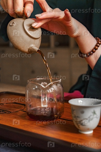 Спокойный момент налива чая захватывает изысканный чайник и чашку чая, красиво представленные в элегантной обстановке