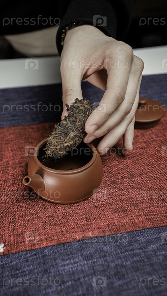 Умелая рука кладет обработанный чайный кирпич в чайник, улучшая аутентичный опыт чайной церемонии