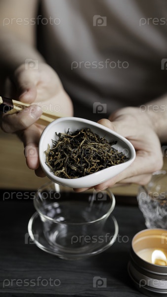 Близкий взгляд на руки, нежно держащие сушеные чайные листья, представленный в элегантной и спокойной обстановке для приготовления чая