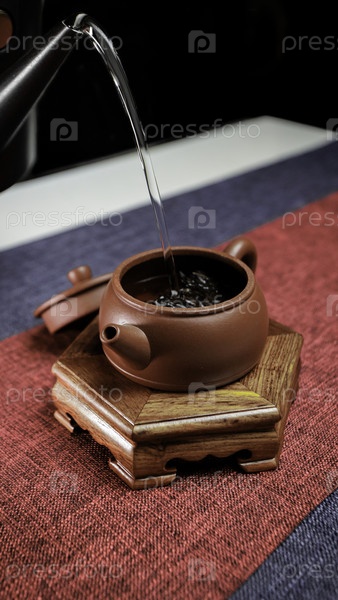 Разворачивается безмятежная чайная церемония, в которой используется традиционный чайник, который грациозно разливает горячую, взлетающую воду