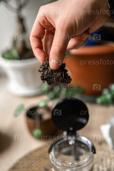 Рука держит высушенную траву над стеклянным контейнером в уютной и привлекательной обстановке