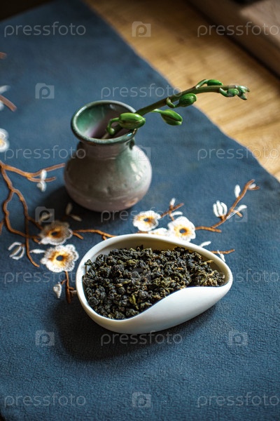 Красиво устроенная инсталляция с зеленым чаем, элегантной вазой и детальными цветами на поверхности мягкой ткани