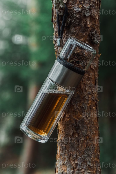 Стеклянная бутылка висит на ветке, сочетая функциональность с потрясающей природной красотой