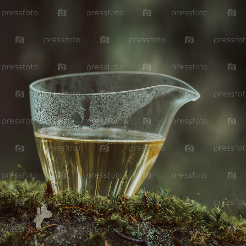 Стеклянный кувшин травяного чая опирается на пышные мхи в безмятежном лесу, приглашая к релаксации и спокойствию