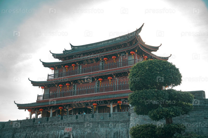 Потрясающий вид на историческое азиатское здание, украшенное фонарями и окруженное пышной зеленью