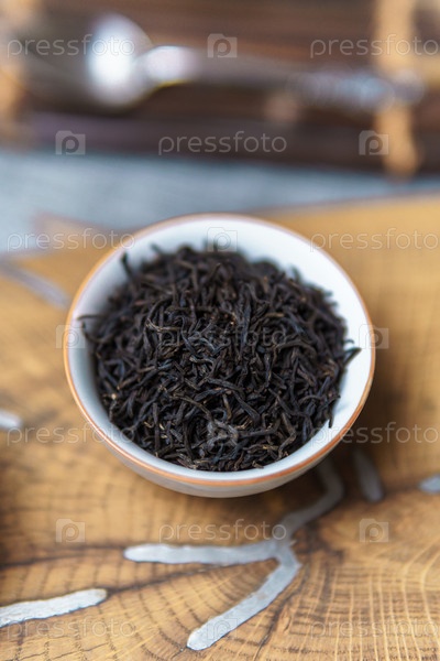 Близкий взгляд, показывающий высушенные листья черного чая, элегантно показаны в маленькой миске, опирающейся на деревянную поверхность