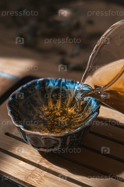 Ремесленник умело заваривает чай в красивой декоративной миске для удовольствия