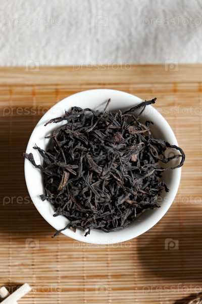 Сушеный черный чай Листья красиво расположены в белой чашечке, помещенной на бамбуковом коврике