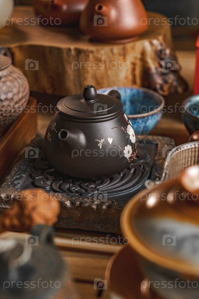 Элегантный чайный набор с различными красиво выполненными чайниками и мисками