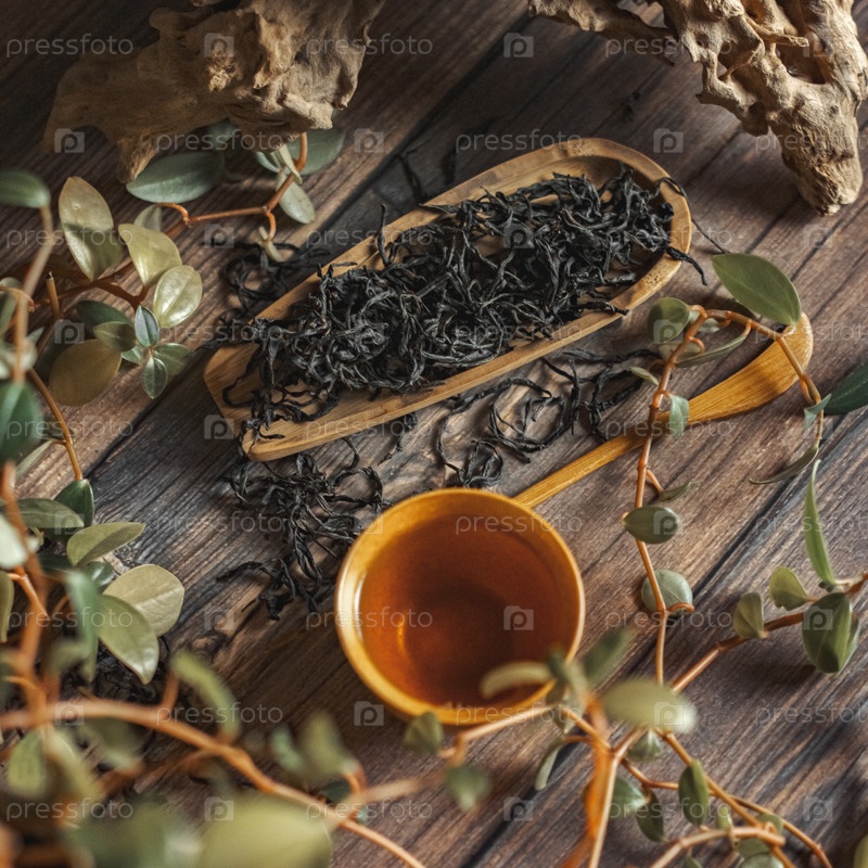Красиво устроенная коллекция листьев черного чая рядом с приглашающей чашкой и в окружении пышной зелени