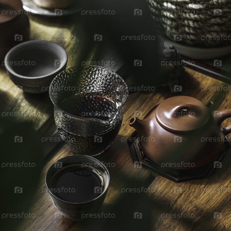 Спокойная чайная обстановка с элегантными чашками, кипятком и мягким освещением для уютной атмосферы