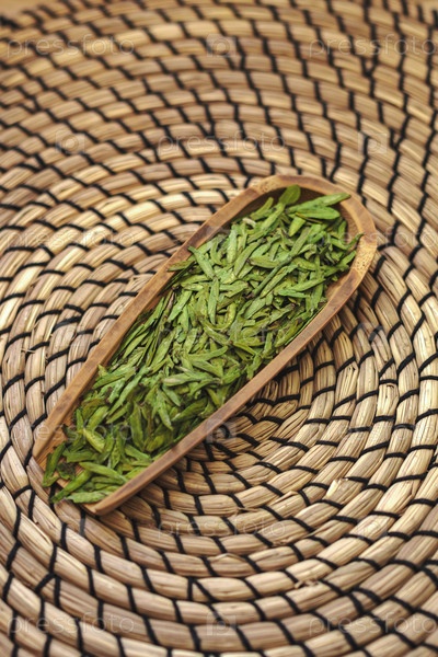 Листья органического зеленого чая красиво расположены в деревянной миске на декоративном плетеновом фоне