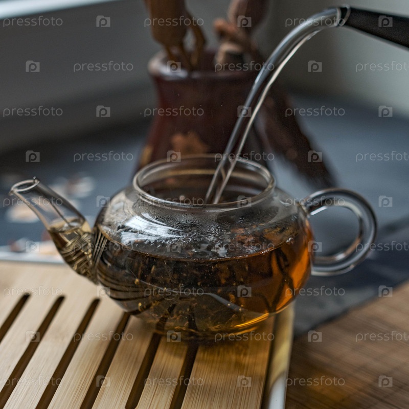 Потрясающий и красиво выполненный стеклянный чайник, оснащенный инфузориями, представляющими собой поднимающиеся вверх чаевые листья