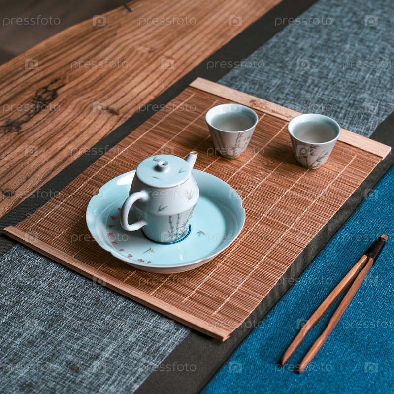 Спокойный чайной набор с нежным, красивым чайным набором на деревянном коврике, идеально подходит для любителей чая